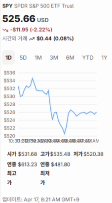 4월 16일 2.2%↓ 마감해 525.66달러, 2월 고점(613.23달러) 대비 14% 하락했어요.