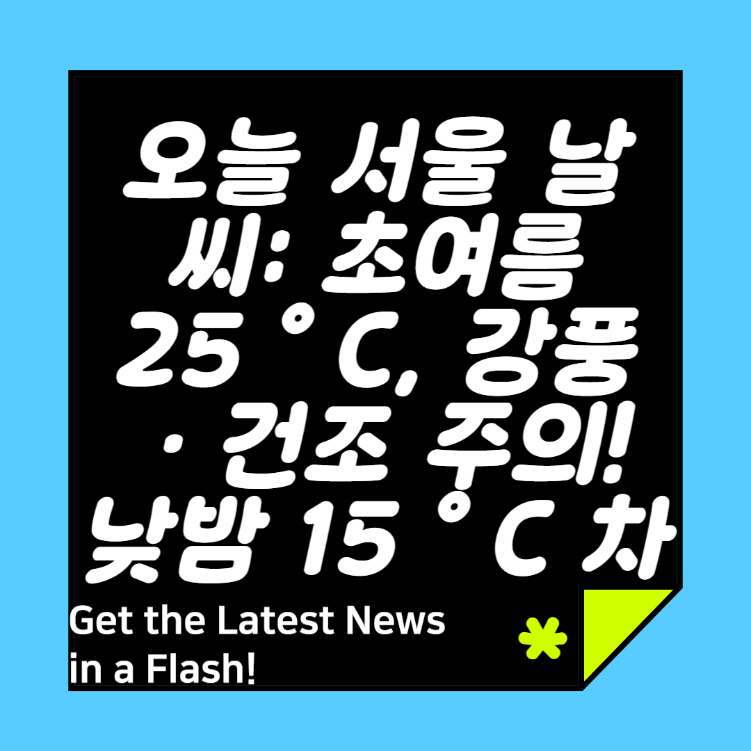 오늘 서울 낮 25°C 초여름 더위, 밤 12°C 쌀쌀! 강풍 55km/h, 건조 특보, 미세먼지 좋음~보통. 겉옷과 수분 보충 챙기세요!