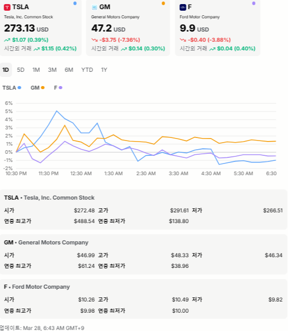 요약설명: 트럼프, 25% 자동차 관세 강행! 뉴욕증시 3대 지수 하락, 테슬라 주가 상승, GM·포드 급락.