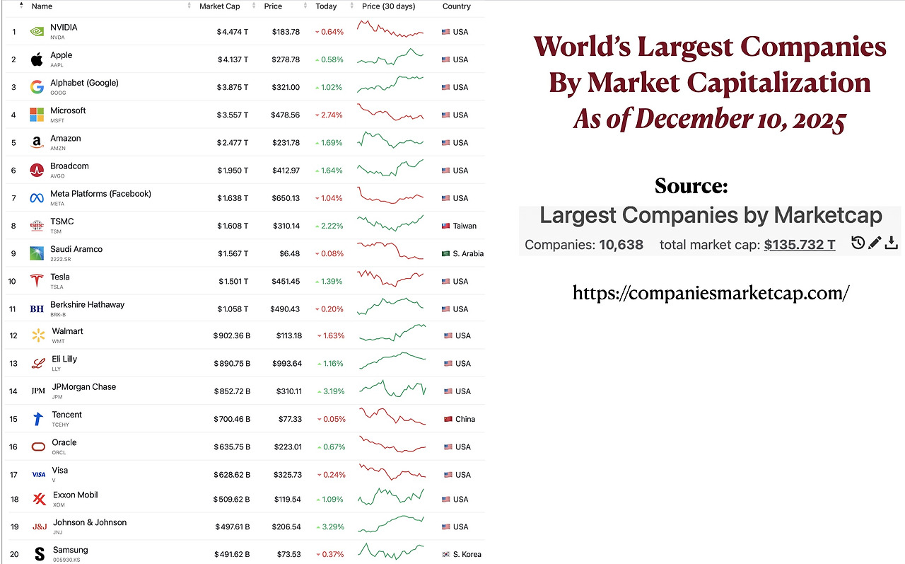 - 탑10 개요: AI 중심 테크 기업 지배, Nvidia가 1위 (~4.5T USD) 유지. 상위 8개 중 테크 기업. (High Confidence)
